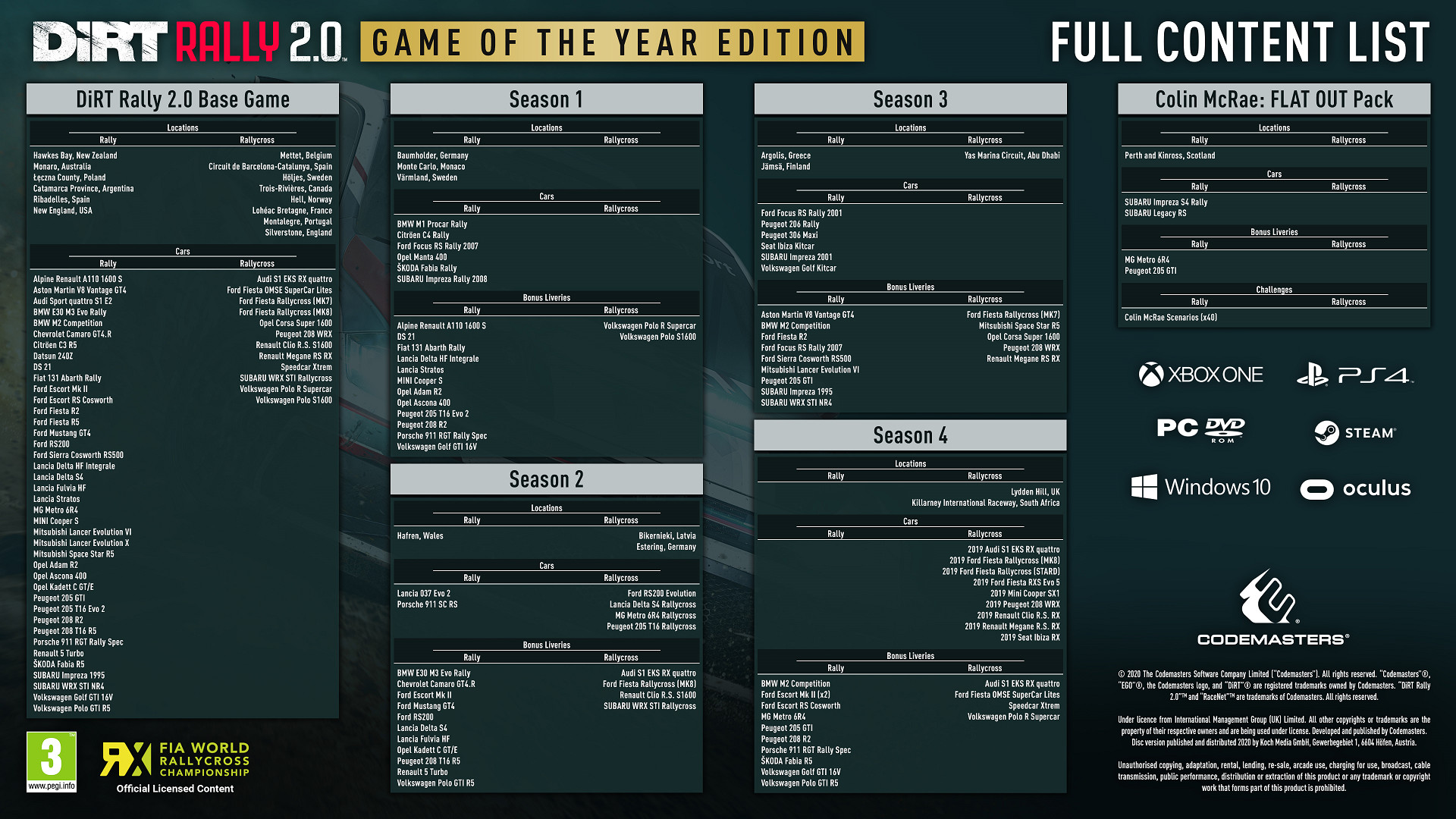 DiRT Rally 2.0 Game of the Year Edition includes the base game and every single one of its post-launch additions, including all Seasons content and the Colin McRae: FLAT OUT Pack. Every car, every location, every piece of content ever released for DiRT Rally 2.0 is included, making the Game of the Year Edition the definitive version of our award-winning off-road title.